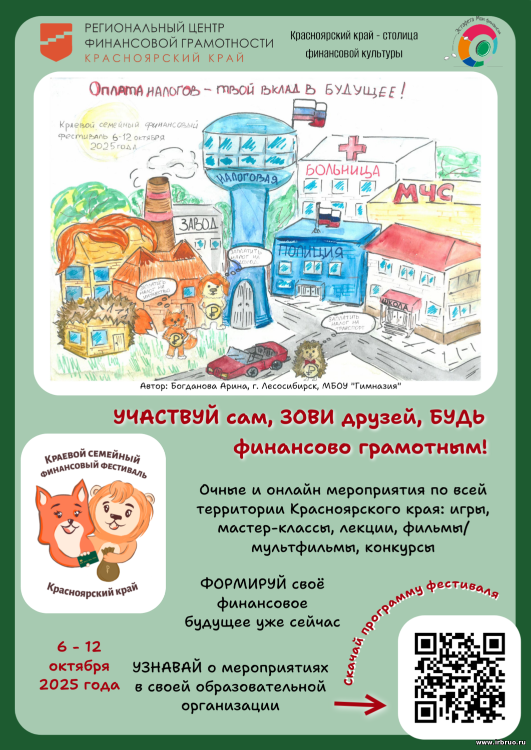 Переходите на сайт Краевого семейного финансового фестиваля https://finfest24.ru. Скачивайте онлайн-программу, а также участвуйте в очных мероприятиях в образовательных организациях нашего района.